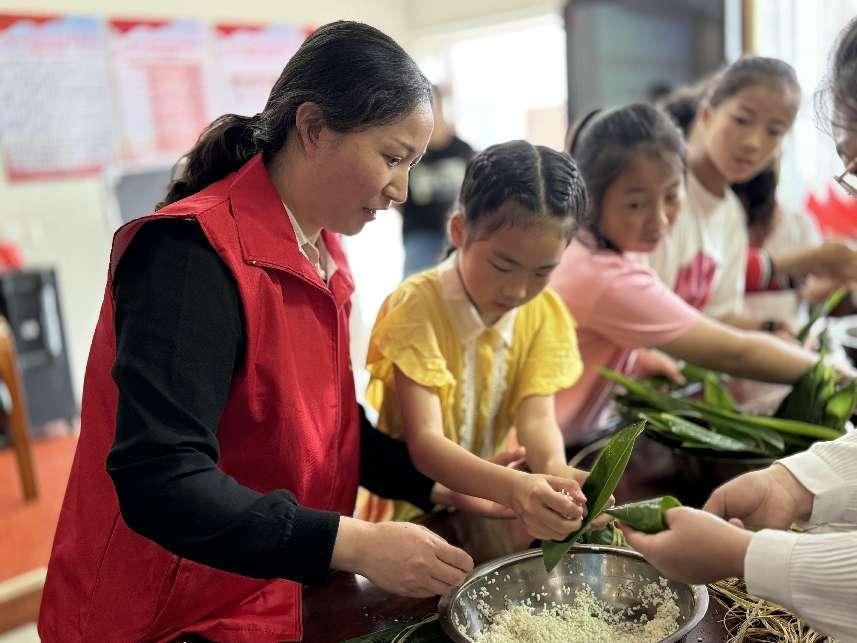 隨后,黨員同志們分發(fā)提前準(zhǔn)備好的糯米、粽葉等,與孩子們圍坐在一起,挑粽葉、折粽葉、舀糯米、系粽繩……有的巧手翻飛、嫻熟地包著粽子,有的邊看邊學(xué)、逐漸熟練,不多時(shí),一個(gè)個(gè)粽子就包好了,現(xiàn)場(chǎng)歡笑聲不斷。