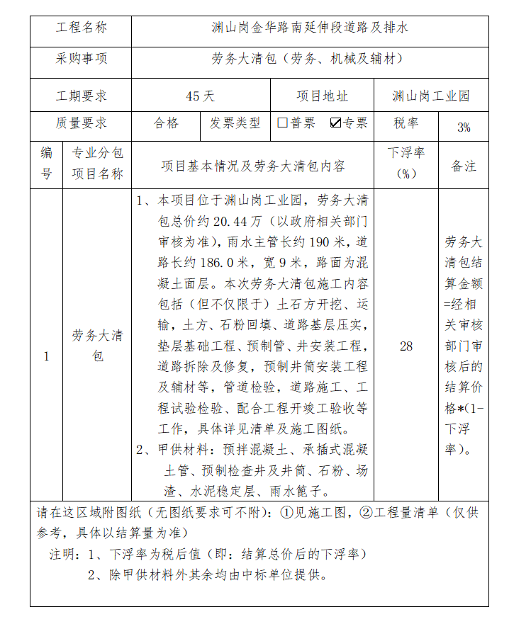 我公司就淵山崗金華路南延伸段道路及排水勞務(wù)大清包采購(采購編號:DXGCT-ZX-2025-016),誠邀貴公司響應(yīng)報價。需求如下: