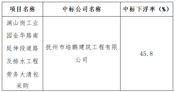 淵山崗工業(yè)園金華路南延伸段道路及排水工程勞務(wù)大清包采購中標(biāo)結(jié)果公示