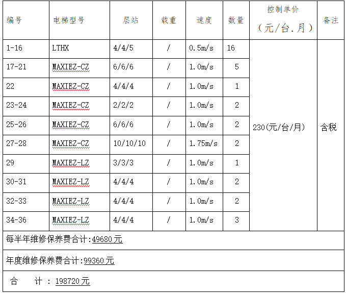 2、報價說明:1.每月至少對所保養(yǎng)的電梯巡檢兩次。2.定期向甲方報告保養(yǎng)設備的運行情況,零部件使用情況,易損的更換情況,并做好詳細記錄。3、檢查調(diào)整各項機件及安全保護系統(tǒng)。4、指導甲方操作及正確使用設備,協(xié)助建立相應的電、扶梯管理制度,建立扶梯維修、保養(yǎng)記錄檔案。5、在接到客戶緊急報修后,在規(guī)定的時間內(nèi)30分鐘之內(nèi)及時派員趕赴現(xiàn)場排除故障。6、保養(yǎng)期為2年,開具增值稅6%專用發(fā)票。