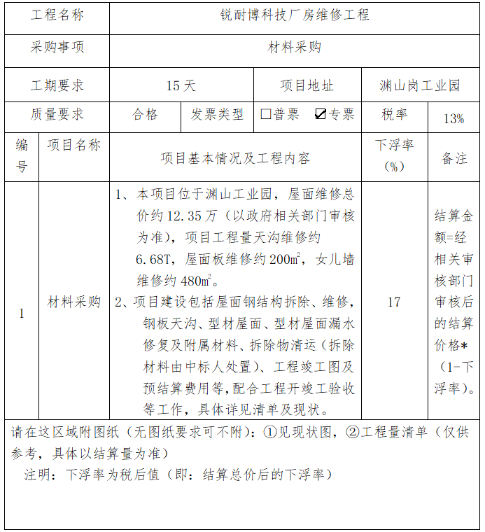 我公司就銳耐博科技廠房維修工程材料采購(采購編號:DXGCT-ZX-2026-001),誠邀貴公司響應(yīng)報價。需求如下: