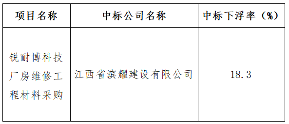 銳耐博科技廠房維修工程材料采購(gòu)中標(biāo)結(jié)果公示
