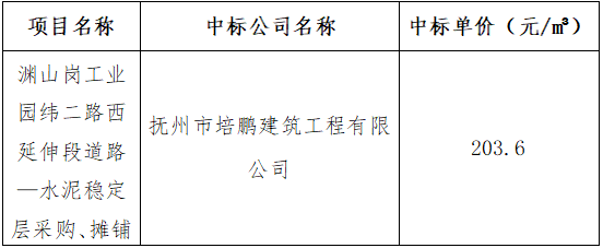 淵山崗工業(yè)園緯二路西延伸段道路工程專業(yè)分包中標(biāo)結(jié)果公示